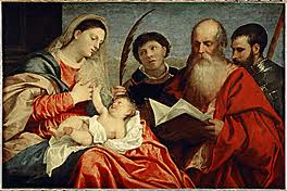 Lipstick and film companies have spent a fortune trying to duplicate the hue of the unique red color that characterizes Titian’s paintings. One clue that has not yielded results is that as a very young boy Titian used to make his younger sister collect flowers from the meadows in her apron. This diligent little assistant would separate them by colors. Thus, she prepared his palette. The precocious artist would then press the flowers against dilapidated walls, staining them permanently. Many a decrepit building became the canvas for a painting of a beautiful Madonna.