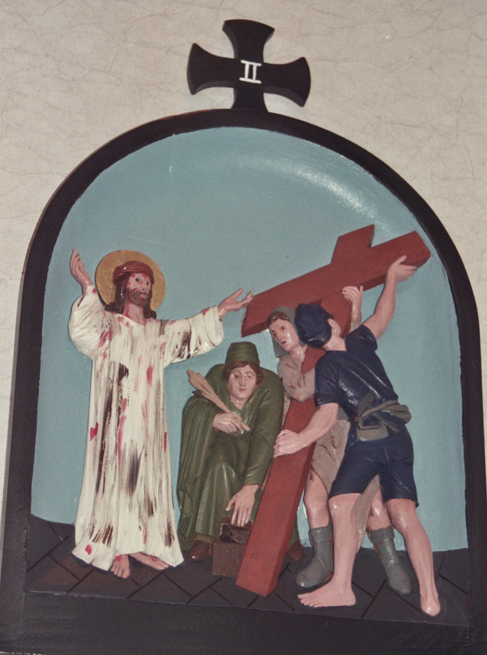 He is given help but not out of pity, but because the soldiers do not want Him to die along the way. Finally, some one takes pity and wipes His blood-stained and battered face; the soldiers interfere because there is no time to rest and force Him on to His destination.